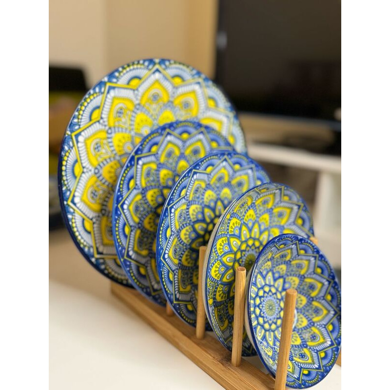 يُصنع طقم الصحون من مواد مصنوع من البورسلين أو السيراميك، مما يضفي عليها لمسة من الفخامة والمتانة.