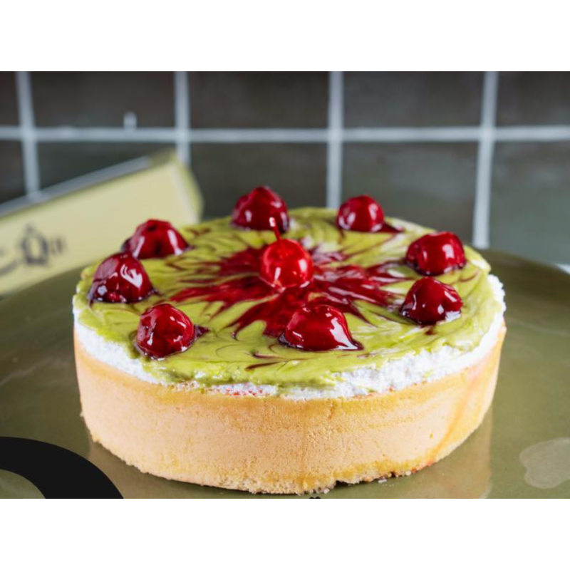 كيك لذيذ يجمع بين الكريم المخفوق والفستق مع لمسة خفيفة من قطع التوت الطازج.