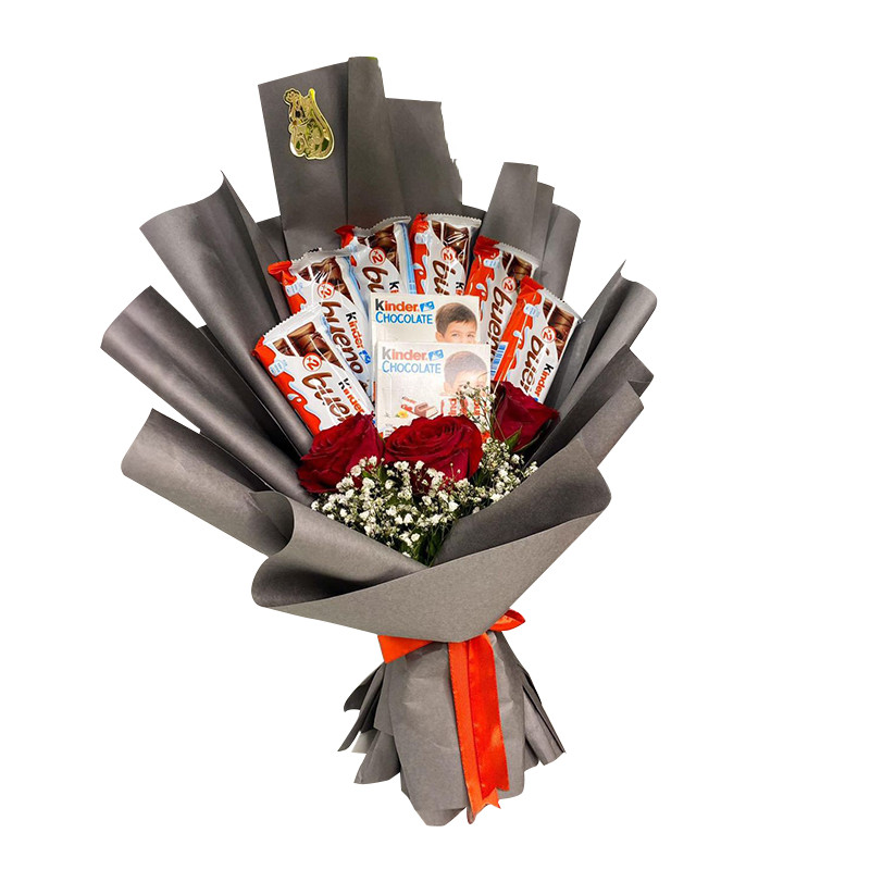 تتضمن الباقة 3 وردات طبيعية و8 قطع شوكولاتة كندر