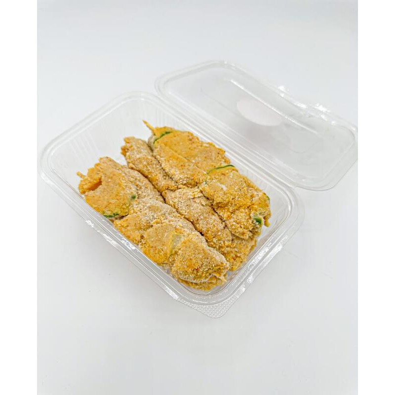 قطع من الدجاج المتبل وقطع من البصل والفلفل الحلو والمغلف بالخبز المقرمش.