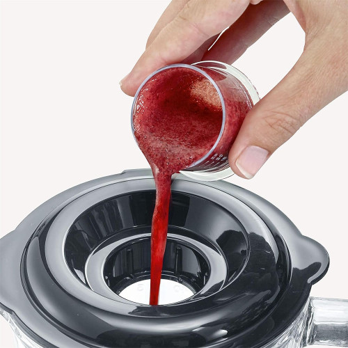 وعاء الخلاط مصنوع من الزجاج القوي و مزود بشريط قياس مدمج وفتحة لتسهيل إضافة المكونات