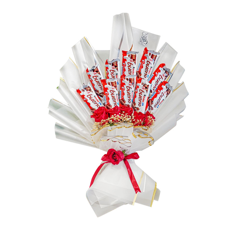 تتضمن الباقة 6 وردات طبيعية و10 قطع شوكولاتة كندر بوينو